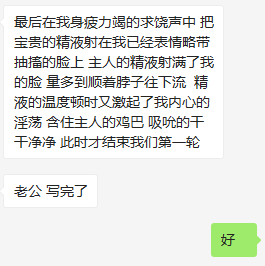 最后在我身疲力竭的求饶声中 ,把宝贵的精液射在我已经表情略带抽搐的脸上, 主人的精液射满了我的脸, 量多到顺着脖子往下流, 精液的温度顿时又激起了我内心的淫荡, 含住主人的鸡巴, 吸吮的干干净净, 此时才结束我们第一轮。